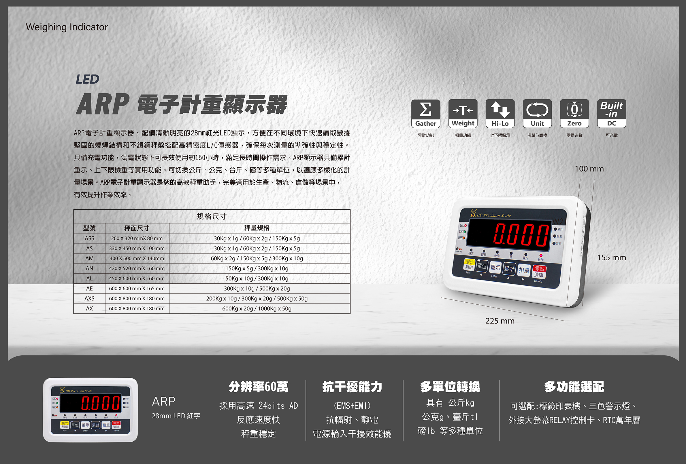 ARP顯示器具備累計重示、上下限檢重等實用功能,可切換公斤、公克、台斤、磅