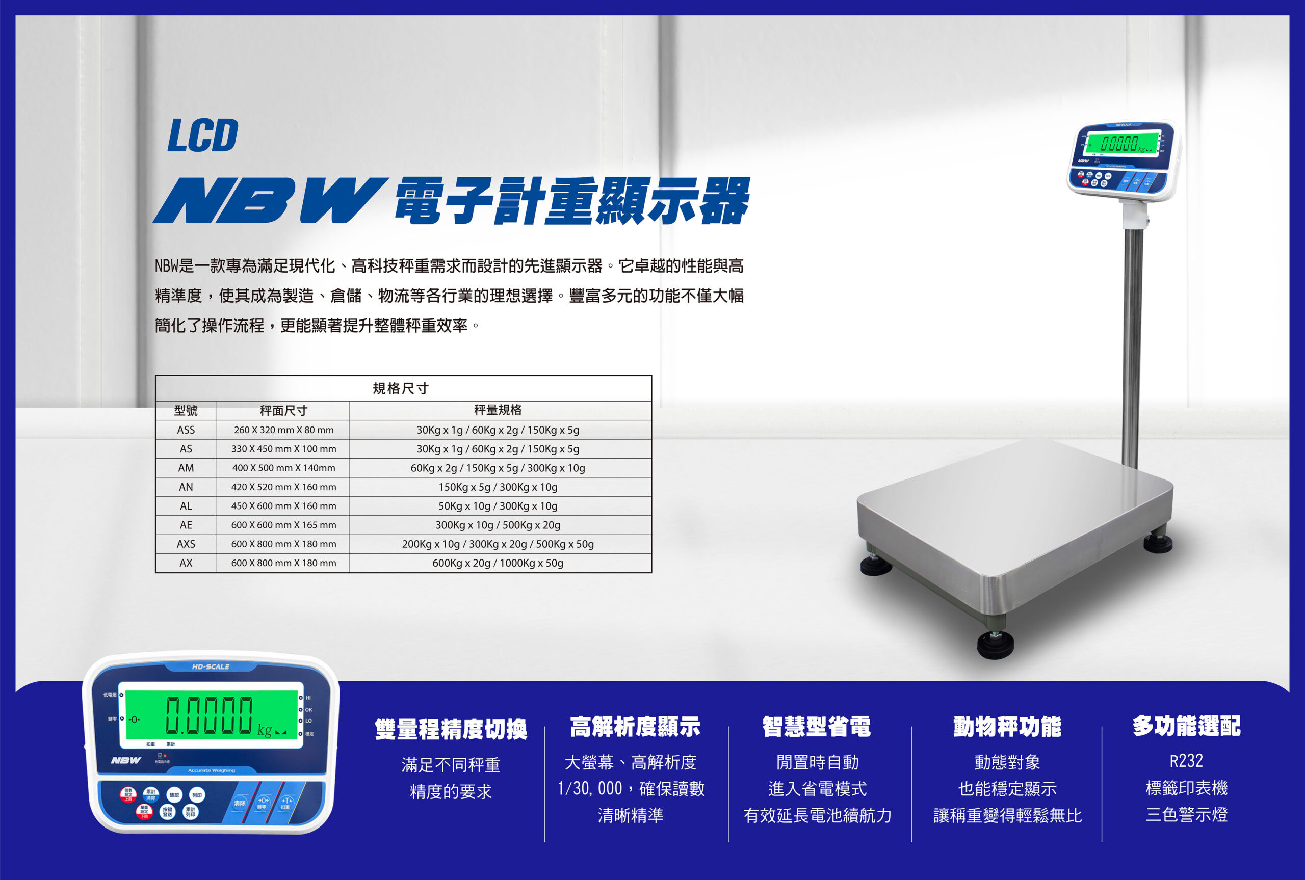 1.雙量程精度切換:滿足不同秤重、精度的要求 2.大顯示屏幕:25mm 高字幕、大屏幕顯示、清晰好讀取 3.智慧型省電:閒置時自動、進入省電模式、有效延長電池續航力 4.動物秤功能:動態對象、也能穩定顯示、讓稱重變得輕鬆無比 5.多功能選配:R232、標籤印表機、三色警示燈 滑鼠右鍵另存連接下載 NBC NBE NBW共用說明書 NBW電子計重顯示器![]()