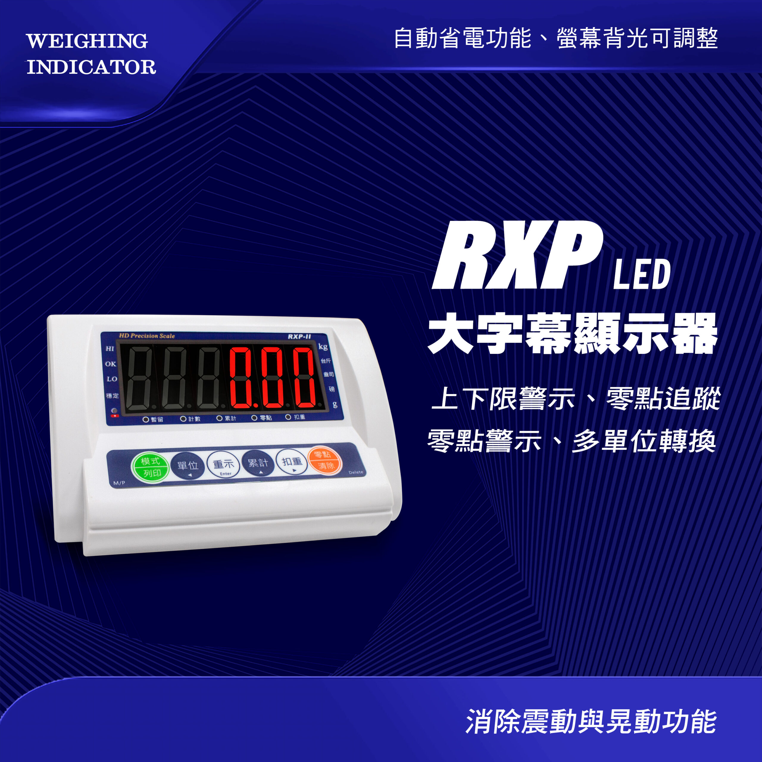 RXP大字幕顯示器是秤重的最佳選擇,45MM紅色背光大字幕室外陽光下使用數據清晰易讀,操作方便高效。 堅固的不鏽鋼秤盤和高精度傳感器,確保每次測量的穩定與精確。 內建150小時續航力,適合長時間使用,並具備累計、重示、 上下限檢重等功能,輕鬆應對多種需求。 支持多種重量單位切換,滿足各種場景應用,還可選配、 印表機和檢重警示燈,讓操作更靈活,提升工作效率。 適合工廠、倉庫等環境,是提高秤重精度與效率的理想解決方案。